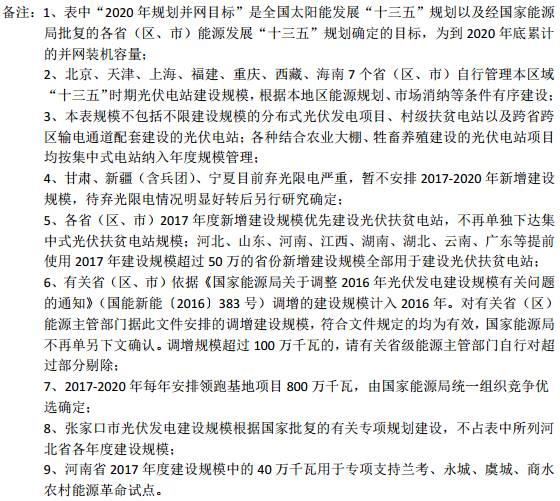 从各省(区、市)情况看,北京、天津、上海、福建、重庆、西藏、海南7个省(区、市)自行管理本区域“十三五”时期光伏电站建设规模,根据本地区能源规划、市场消纳等条件有序建设;甘肃、新疆(含兵团)、宁夏目前弃光限电严重,暂不安排2017-2020年新增建设规模。