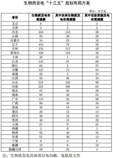 在文件中,国家能源局公布了各省(区、市)“十三五”风电、光伏发电分年度建设规模方案,并将各省(区、市)生物质发电(主要包括农林生物质发电和垃圾焚烧发电)“十三五”规划布局规模一次性下达。