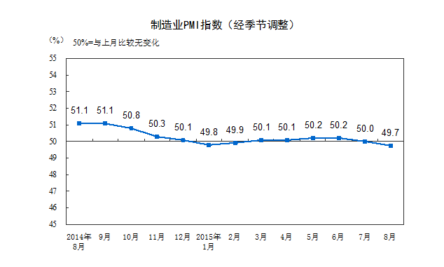 凤凰财经讯 据统计局消息,2015年8月份,中国制造业采购经理指数(PMI)为49.7%,比上月回落0.3个百分点,降至临界点下方,这是2月以来首次跌破50。